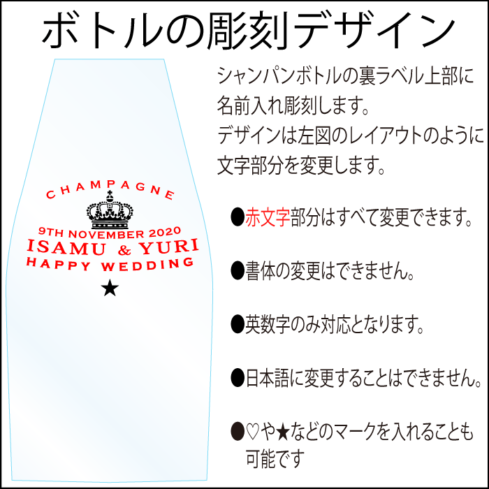 シャンパンボトルのボトル裏面(品質ラベル)の上部にオリジナル彫刻します。 ※彫刻部分にシルバー着色加工します。